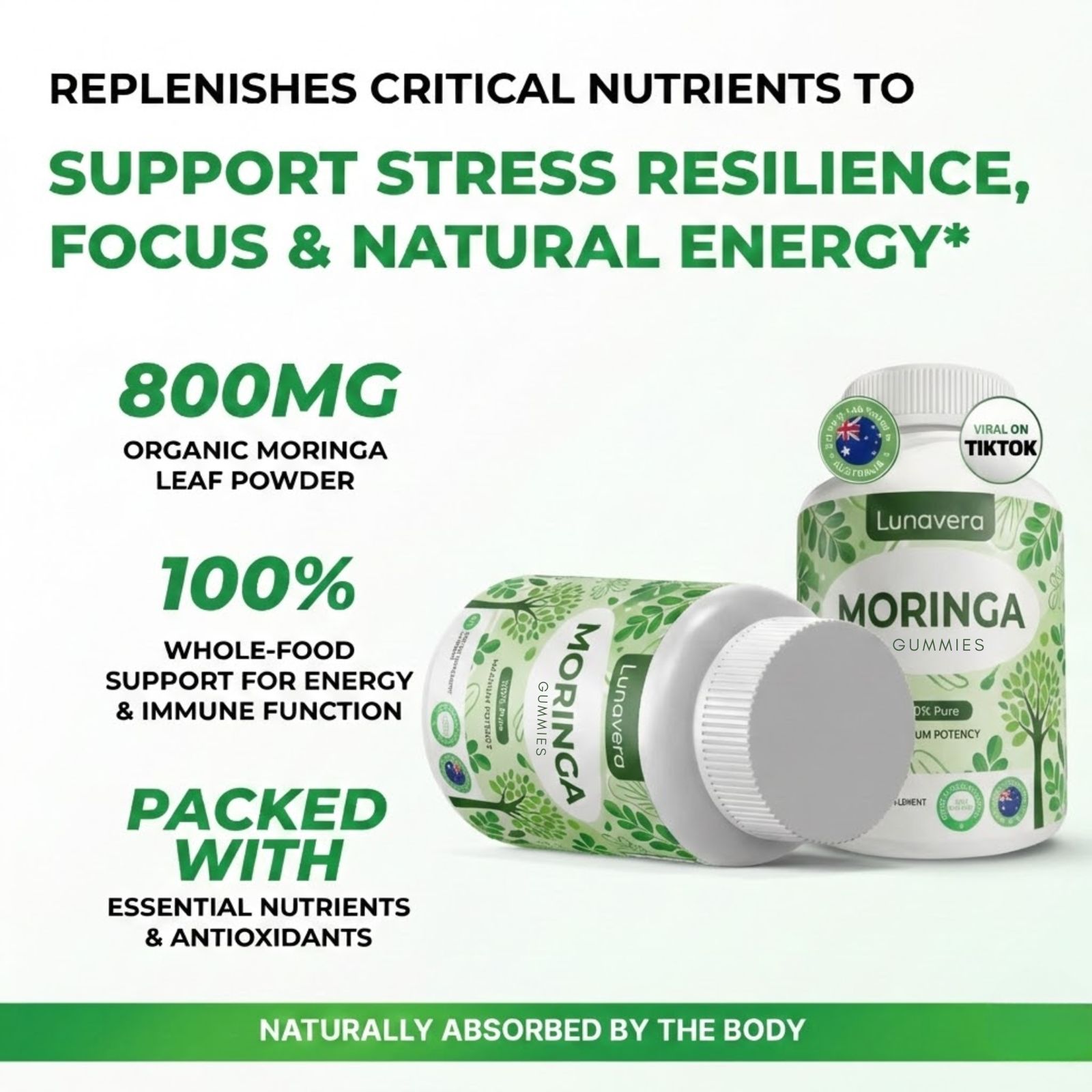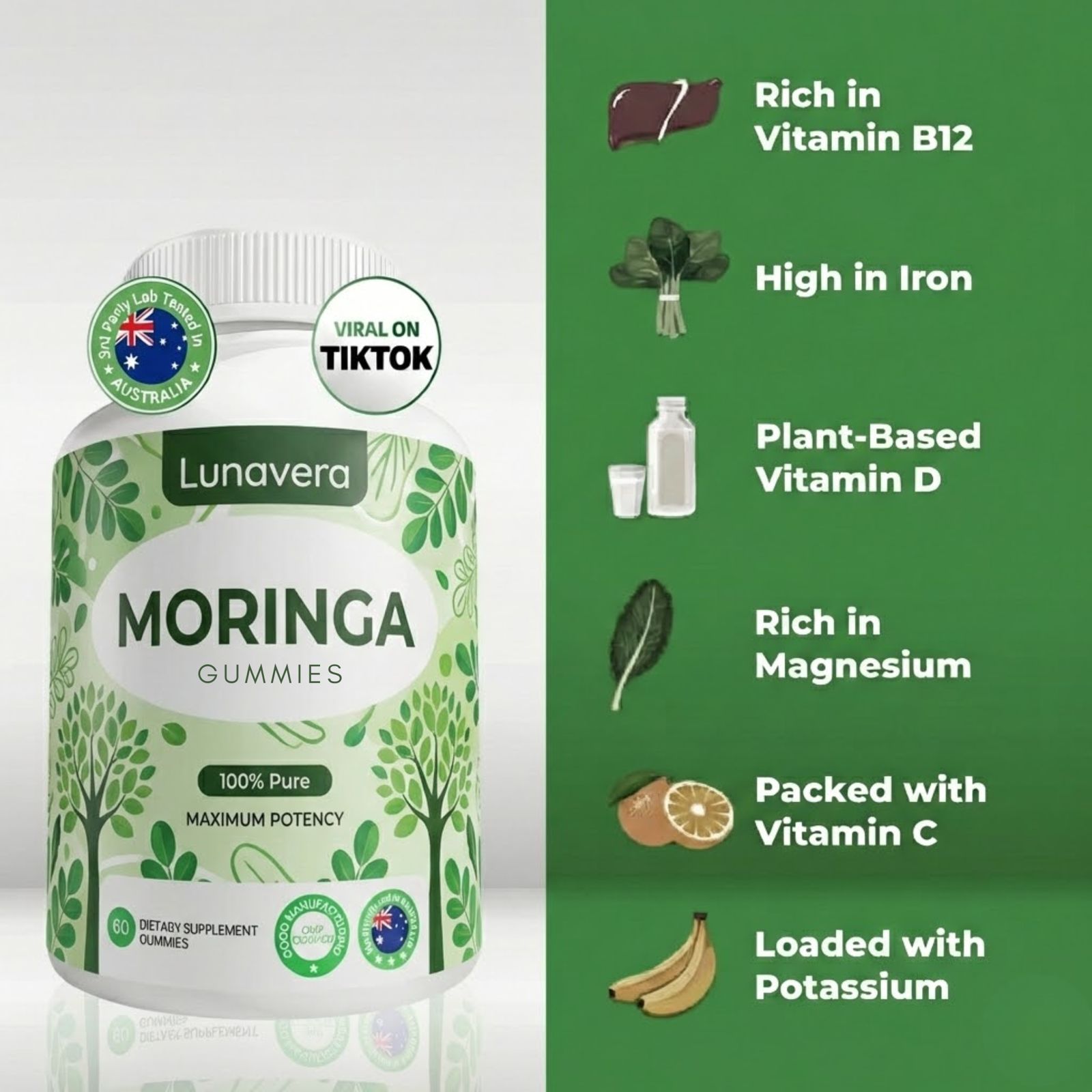 Lunavera Moringa Gummies provide a concentrated source of nutrients your body needs to function at its best, including B vitamins, magnesium, iron, and antioxidants. These nutrients play important roles in supporting natural energy production, immune function, and overall vitality when taken consistently as part of a healthy lifestyle.